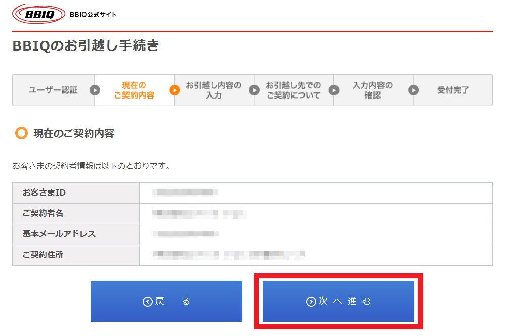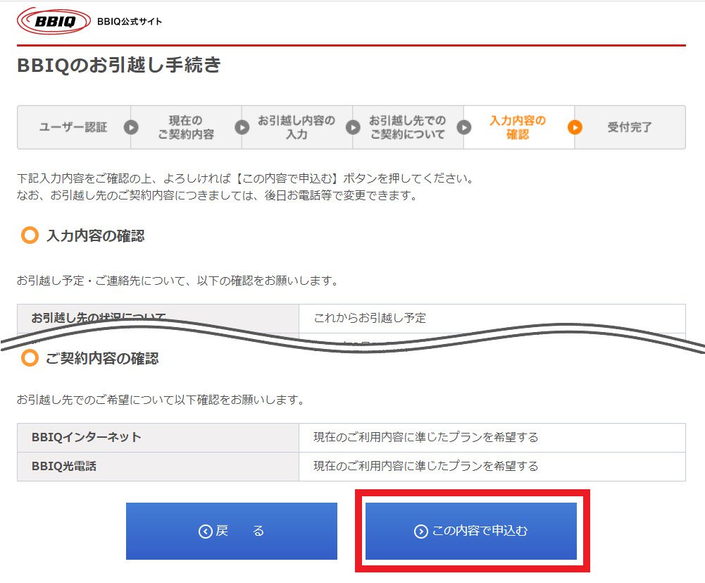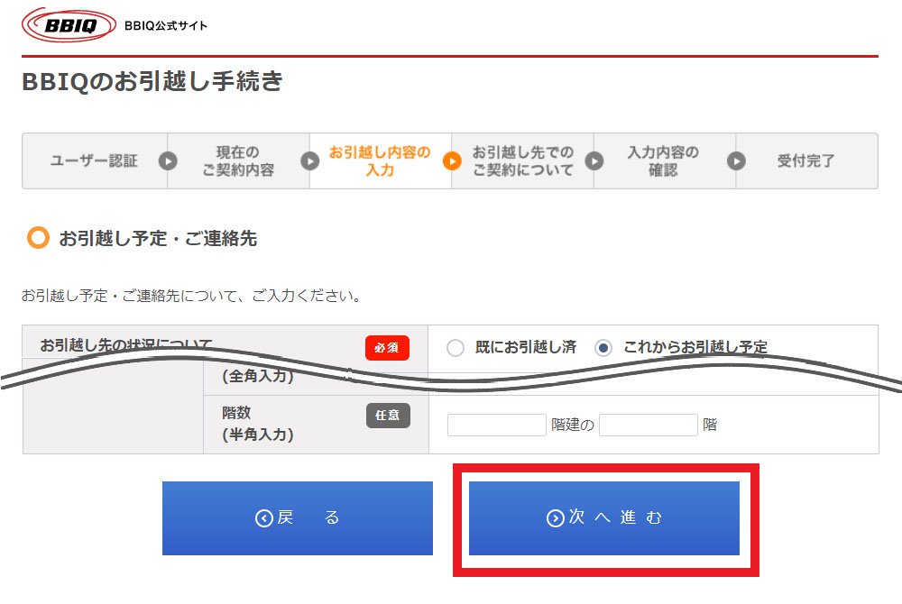 お手続きの流れ STEP1サービスエリアを確認する お引越し先がBBIQのサービスエリアであるか、サービスエリアチェックをおこなってください。 サービスエリア検索 お引越し先がBBIQサービス提供エリアのお客さま STEP2へお進みください。 お引越し先がBBIQサービス提供エリア外のお客さま QTnetがお届けするコラボ光を活用した光インターネットサービスで、NTT西日本と同じエリアでご利用できるBBIQライトをご検討ください。 BBIQライト STEP2住所変更のご連絡(お電話またはWeb) お引越しの手続きに関する注意事項をご確認の上、お電話またはWebからのご連絡をお願いします。 お引越し手続きに関する注意事項 お電話でお手続きする場合 QTnetお客さまセンターまでお電話ください。 QTnet お客さまセンター(移転) 0120-911-808 【受付時間】 9:00~18:00 / 年中無休 マンションまるごとBBIQを導入した物件へお引越しの方は、マンションまるごとBBIQお問合せ窓口(0120-28-6209)までお電話ください。 番号はお間違いのないようにご注意ください。 今後のサービス向上のために通話は録音させていただきます。 Webでお手続きする場合 Webでお手続きを行う場合は、QTnet会員専用ページから行います。 1 QTnet会員専用ページにログイン後、上部メニューのご契約サービスを選択して、「BBIQのお引越し手続き」のお手続きへ進むを選択します。 QTnet会員専用ページ 2 「お引越し先のBBIQ提供状況」のエリア内を選択し、次へ進むを選択します。 3 現在のご契約内容をご確認いただき、次へ進むを選択します。 4 お引越し予定・ご連絡先など、必須項目をご入力の上、 次へ進む を選択します。 5 お引越し先でのご希望を選択して、次へ進むを選択します。 6 ご入力内容をご確認の上、 この内容で申込む を選択します。後日QTnetお客さまセンターから、折り返しのご連絡をさせていただき、受付完了となります。 お申込み後、5日間経過してもQTnetお客さまセンターから連絡がない場合は、正常に受付できていない可能性があります。 その際は、お手数をおかけしますがQTnetお客さまセンター(0120-911-808)までご連絡をお願いします。 STEP3工事について 現住所の撤去工事 光ファイバーケーブルや回線終端装置の撤去を行いますので、お客さまには工事立会いをお願いします。工事日程については、別途、電話連絡の上、調整させていただきます。 お引越し先での開通工事 当社にて光ファイバーケーブルの宅内引き込み工事の準備が整い次第、工事を行いますので、お客さまには工事立会いをお願いします。工事日程については、別途、電話連絡の上、調整させていただきます。 工事の流れなど詳しくはご利用までの流れ:QTnetで対応することをご覧ください。 STEP4BBIQのご利用開始 インターネットの接続確認後、ご利用開始となります。 BBIQ光電話もご利用のお客さまは、BBIQ光電話の開通確認も必要となります。 BBIQ光電話の移転について お引越し先でもBBIQ光電話をご利用いただけますが、光電話の電話番号はお引越し先のご住所により変更になる場合があります。また、BBIQの移転工事費とは別にBBIQ光電話の初期費用(光電話1回線あたり)が必要となります。 BBIQ光電話 初期費用 詳しくは、QTnetお客さまセンターへお問合せください。ご利用中の電話番号の継続利用の可否、お手続き方法について、詳しくご案内いたします。 QTnet お客さまセンター(移転) 0120-911-808 【受付時間】 9:00~18:00 / 年中無休 番号はお間違いのないようにご注意ください。 今後のサービス向上のために通話は録音させていただきます。